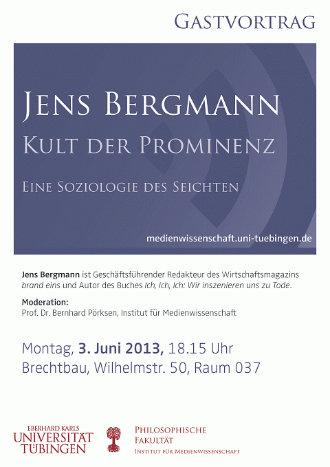 Metrolit goes UniMetrolit-Autor Jens Bergmann (“Ich, ich, ich - Wir inszenieren uns zu Tode”) hält einen Gastvortrag an der Uni Tübingen: Kult der Prominenz - Eine Soziologie des Seichten |